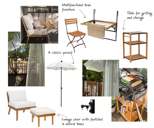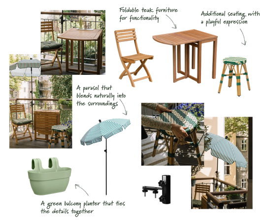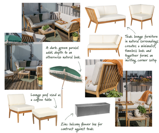 Teak furniture is not only timeless, but also designed to last for many years. Natural materials are an ideal choice, especially if you want to add warmth to your outdoor space, as they form a strong foundation for the overall look. By introducing a secondary colour – in this case green – you can work with different shades of the same colour and create a more playful expression without compromising the timeless aesthetic. In this setup, the green tones are expressed through the parasol, additional seating, balcony planters and textiles.