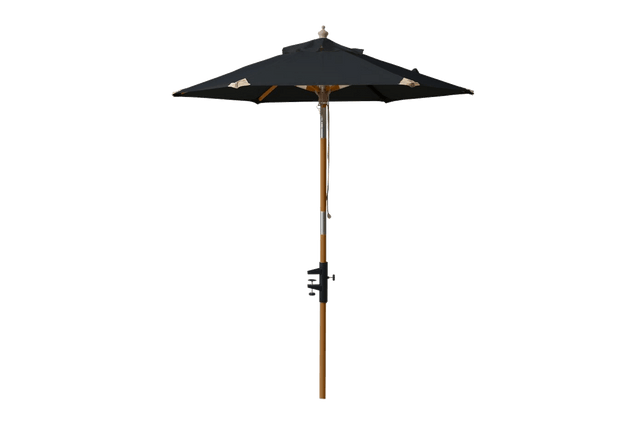 Balcony parasol with a teak-colored wooden two-piece pole. The parasol can be tilted. The parasol comes with a sturdy balcony parsol bracket. The bracket fits a square balcony railing with a height of max 5,5 cm.