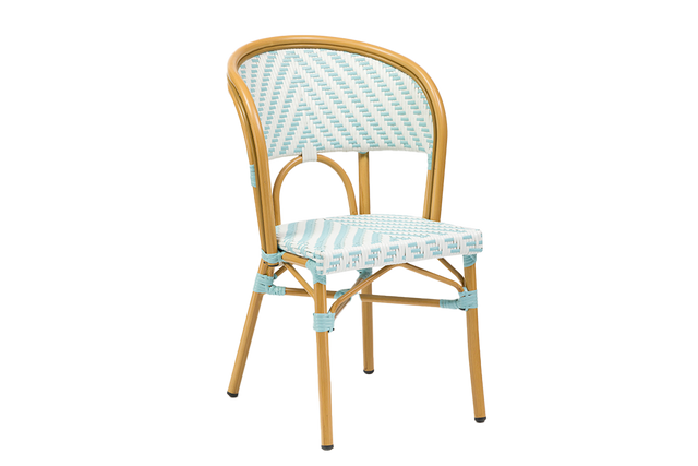 Bring a touch of Parisian charm to your balcony or terrace with the Delphine Chair. The delicate weaving in white and light blue creates a light and elegant expression, while the weather-resistant aluminum frame with a bamboo look ensures long-lasting durability. This chair is ideal for both private outdoor spaces and professional environments such as cafés and restaurants.