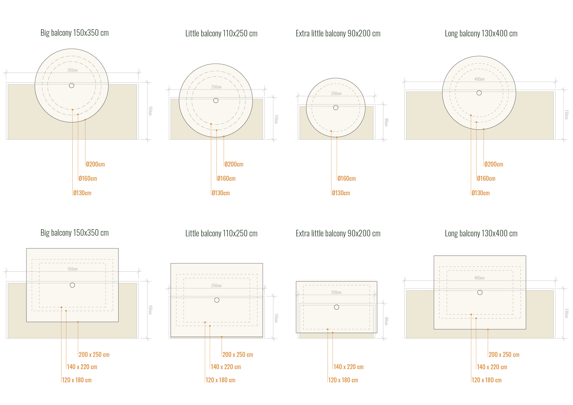 That’s why we’ve created a visual guide showing how different parasol sizes fit balconies of varying lengths and depths.