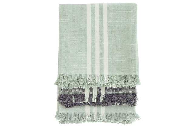 Tea towels in cotton with fine stripes from Madam Stoltz, practical for the outdoor kitchen on the balcony or also inside. The soft colors: aqua, mint and grey all with a subtle white stripe match very well with each other.